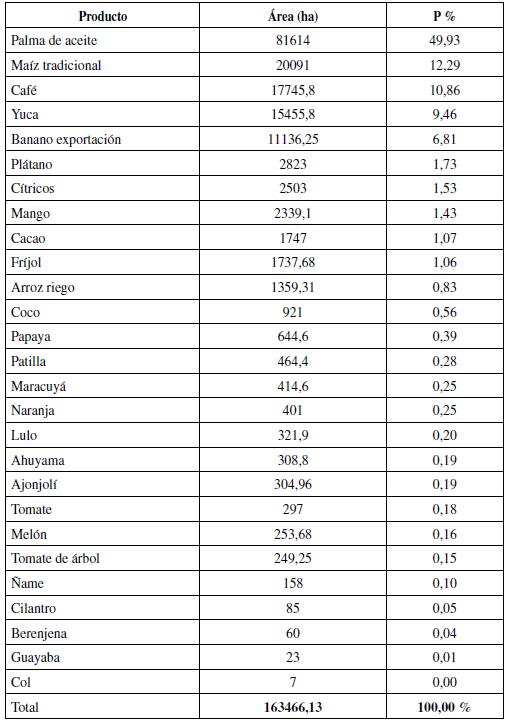 En lo que respecta a la producción económica, una de las actividades económicas de mayor representación en el producto interno bruto (PIB) del departamento es la agricultura, ganadería, caza, silvicultura y pesca; según el DANE, este sector contribuyó con el 15,2 % del PIB en 2016. Buena parte de estas actividades se desarrollan, precisamente, en municipios diferentes de la capital del departamento; Santa Marta, entre ellos, los que se analizaron en este estudio. En el ámbito agrícola, según Agronet, es muy común en el departamento del Magdalena el cultivo de palma de aceite (50 % de las hectáreas cosechadas del departamento en 2016) y café (11 % de las hectáreas cosechadas del departamento en 2016) (Anexo 5). También se da el banano de exportación, pero en menor proporción de hectáreas cosechadas (7 %), sin embargo, tiene una producción realmente importante, lo que lo convierte, entonces, en el cultivo con mayor rendimiento por hectárea (37,16 t/ ha) del departamento.