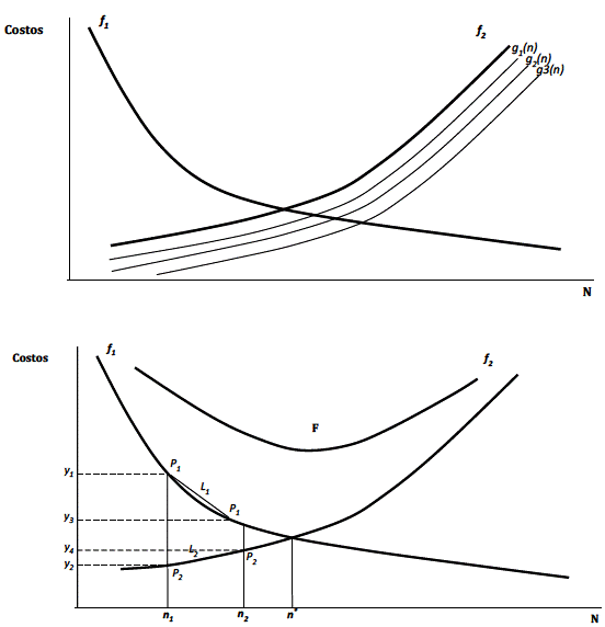Como se muestra en la Figura 2-11, el incremento de la población a la cual se le provee un bien público determinado supone una disminución de los costos medios de producción (f1) derivada de la obtención de economías de escala asociadas a la configuración geográfica, tales como las de aglomeración, alcance y red, así como de la propiedad de no rivalidad en el consumo de bienes públicos, principalmente.