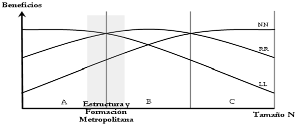 El dilema en la determinación de jurisdicciones metropolitanas puede comprenderse mejor desde la base del análisis económico propuesto por Oates (1972), en donde se relacionan costos y beneficios de proveer bienes públicos respecto al tamaño de la población (N) que los demanda. Ortiz y Pulido (1998) retomaron esta idea adaptándola con la inclusión, por un lado, de los costos de transacción asociados a las estructuras institucionales requeridas para el reconocimiento de las preferencias ciudadanas y, por el otro, de las preferencias y decisiones ciudadanas en el análisis de costos de producción de los bienes públicos respecto al tamaño de la población.