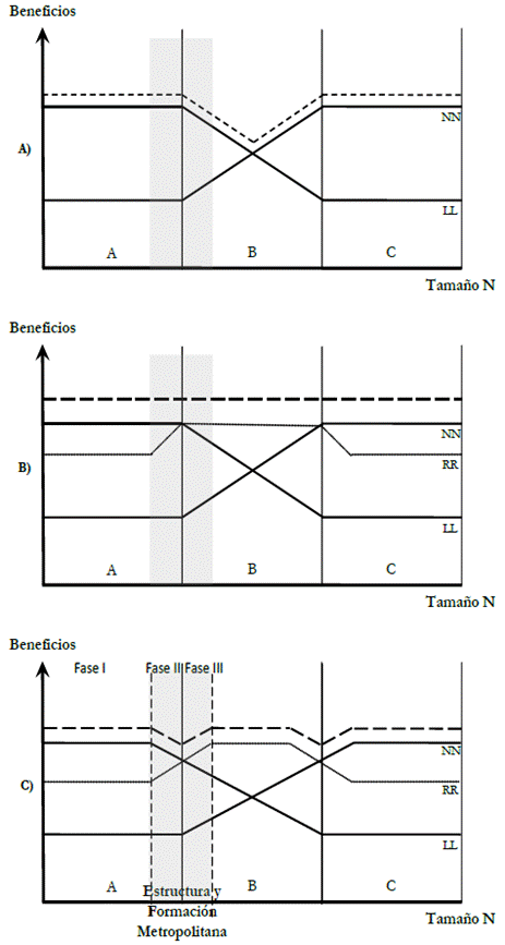 El esquema de la Figura 3-1-C muestra, desde una dinámica de metropolización, cómo el nivel urbano está asociado a una primera fase de consolidación del proceso de urbanización de una ciudad, y, por tanto, la provisión de bienes públicos se basa en la población que hace parte de dicha jurisdicción. Sin embargo, existen casos en los que, a pesar de alcanzarse una consolidación urbana, se genera un umbral de influencia que puede abarcar a una o más jurisdicciones, entrando a una fase de transición y posterior metropolización. Es en estas fases de la metropolización cuando se evidencian los conflictos entre lo urbano y lo regional, pues la multiplicidad de bienes públicos que son posibles de proveer eficientemente al mismo tiempo, y en un borde espacial no muy amplio, estaría indicando la determinación de diversos tamaños óptimos que varían y dan lugar a la franja territorial que caracteriza la estructura espacial metropolitana.