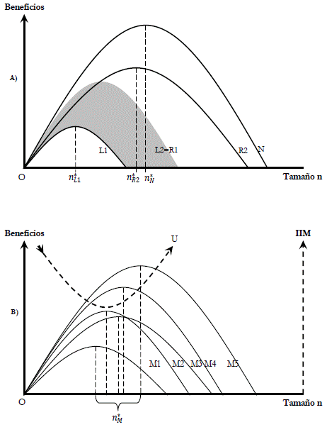 Esta figura presenta una extensión del modelo propuesto por Oates (1972); en el cual, los beneficios derivados de la provisión de un determinado bien público están en función del tamaño de la población que lo consume. La eficiencia económica expresada por los beneficios de esa población dependerá de que la provisión corresponda con las preferencias ciudadanas, las cuales tienden a variar con el incremento de su tamaño. De esta manera, cuando el tamaño de la población crece, la probabilidad de que las preferencias ciudadanas asociadas a los bienes públicos también aumenta y los beneficios por el consumo de ese determinado bien tenderán a disminuir.