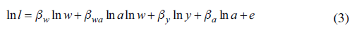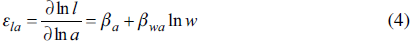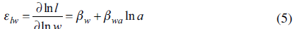 Para obtener la elasticidad de la demanda de trabajo respecto al salario, εlw, se deriva la ecuación (3) en función al salario: