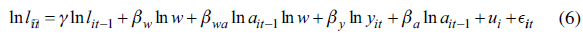 Debido a que la ecuación (3) es de carácter estático, no es posible cuantificar el ajuste lento del empleo ante cambios en los salarios; por lo que se introduce la variable dependiente rezagada con el objetivo de establecer un modelo dinámico, el cual incorpora la trayectoria en el tiempo de la demanda de empleo en relación con sus valores pasados (Gujarati y Porter, 2010). Además, para estimar la demanda de trabajo con base en los datos de panel disponibles, se ajustó dicha ecuación, en ella se considera t = 1, ...,T como el número de periodos de tiempo disponibles e i = 1,N como el número de subsectores de la industria manufacturera.