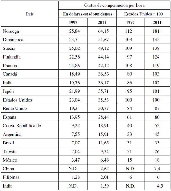 La caída del poder adquisitivo del salario ha sido abrupta, contrario a los efectos positivos augurados por la apertura comercial. En los hechos, las ventajas competitivas de México ante el comercio internacional están sustentadas en la mano de obra barata y relativamente calificada. La Tabla 1 presenta los costos de compensación en la industria manufacturera para 2011; los costos en México representan 18% de los correspondientes a Estados Unidos, principal socio comercial. Dichos datos dejaron de publicarse en 2011 por las diferencias metodológicas para captar la información en cada país, particularmente en China e India.