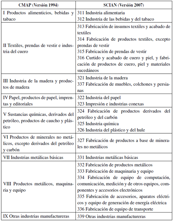 La EMIM proporciona información a seis dígitos (Clase de actividad); sin embargo, como no es posible encontrar el mismo nivel de desagregación para los indicadores de la apertura comercial, publicados por la Secretaría de Economía, el trabajo fue realizado con datos por subsector. Las actualizaciones metodológicas de la encuesta incluyeron nuevas clases de actividad económica que a la fecha se desglosan de acuerdo con el Sistema de Clasificación Industrial de América del Norte (SCIAN)-2007. No obstante, para mantener la serie desde 1987 se decidió trabajar con el desglose a nivel de subsector, como se establecía en el sistema de Clasificación Mexicana de Actividades y Productos (CMAP), versión 1994. En la Tabla 2 se muestra la agrupación realizada.