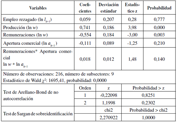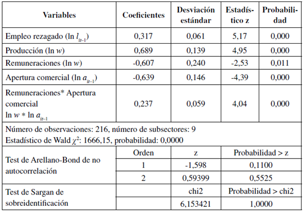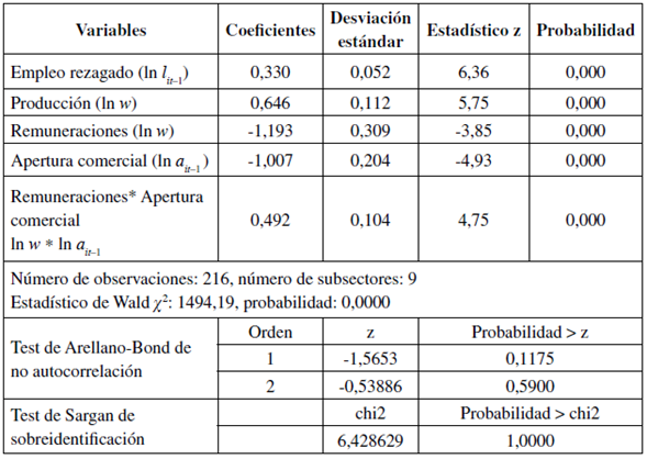 El modelo se estimó utilizando los datos de trabajadores obreros, considerados como empleados no calificados. Los resultados de la Tabla 5, evaluados con la prueba Arellano-Bond, así como con la prueba de Sargan, confirmaron la correcta especificación de la estimación. Todos los coeficientes resultaron significativos y con los signos obtenidos en la regresión conjunta.