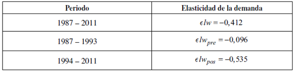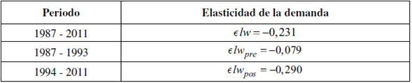 Respecto a las remuneraciones, la demanda de trabajo responde de manera inversa. El incremento en el costo relativo del trabajo motiva el uso intensivo del resto de los factores de la producción, lo cual provoca el efecto sustitución. La variación en los costos totales, propiciada por el incremento en los salarios, empuja al alza el precio del bien y a la baja la producción, lo que se conoce como efecto escala. Los cálculos de la elasticidad de la demanda de trabajo respecto al salario, ecuación (5), se presentan en la Tabla 4, tanto para el periodo en su conjunto (19872011), como para el subperiodo anterior y posterior al TLCAN. El valor absoluto de la elasticidad de la demanda de trabajo se incrementó en el periodo posterior, pues antes de la firma de dicho tratado, por cada 1% que cambiaran las remuneraciones, la demanda de trabajo variaba en 0,079% mientras que en el periodo posterior la variación, fue de 0,29%.
