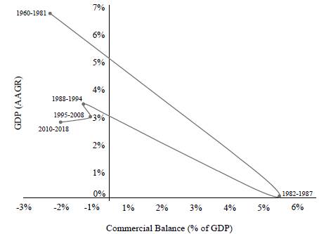 Figure 1 illustrates the weight of external constraint on Mexico's long-term economic growth. Note the deteriorating relationship between the trade deficit (as a percentage of GDP) and GDP growth rates since the debt crisis and the implementation of the first market reforms launched in the 1980s. During 1960-1981, real GDP grew at an average annual rate of 6.6% with a trade deficit equivalent to 1.7% of GDP. The end of the oil boom in 1981-82 and the subsequent crisis caused the economy to stagnate over the next five years and to register a trade surplus (on average 5% of GDP).