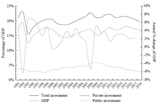 The trajectory of the investment ratio is explained by the fact that the upturn in its private component has been offset by the retrenchment of public investment. In 2012-18 -as in other presidential periods- any attempts for fiscal adjustment were concentrated on cutting spending on the public sector's fixed capital formation. This was politically much more feasible than cutting employment or wages in the public sector.