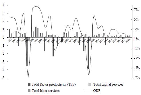 Market reforms failed to induce significant investment to augment and modernize the capital endowment per worker. Without them, any pretence to strengthen labour productivity was illusory (Ros & Ibarra, 2019). The lack of momentum for gross fixed investment (and its virtual stagnation in many industries) made it impossible for capital endowment to signiicantly increase during this period. The persistent lag in labour productivity should not come as a surprise, despite the fact that the NDP placed productivity as the cornerstone of its agenda. As mentioned above, in these years Total Factor Productivity (PTF) actually declined (Moreno-Brid, Dutrenit (coord) 2018).