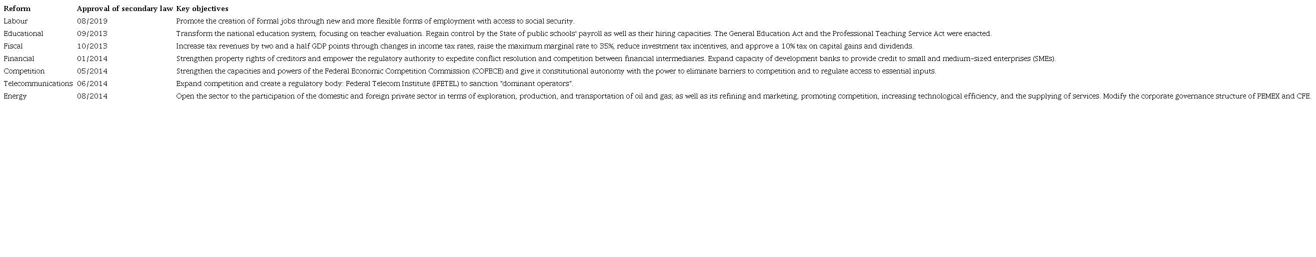 The purpose of this paper is to make an overall assessment of this reform package with regards to its impact on removing -or not- key binding constraints on Mexico's log-term development. It is organized as follows: After the introduction, the next section reflects on the methodological difficulties inherent in assessing the impact of major packages of diverse structural reforms, given their multiple objectives and varied time horizons. Once the analytical underpinnings have been reviewed, a comprehensive assessment is made of the structural reform package as a whole (not of each reform individually) based on what we see as its progress and setbacks in promoting the country's economic growth and development. Subsequently, the paper comments on what we see as the new and the old challenges that the Mexican economy faced at the end of the Peña Nieto administration. This helps to explain the collapse of the PRI in the 2018 Presidential election and its defeat by López Obrador and MORENA, with their campaign focused on the need to fight corruption and to put an end to neoliberalism. We close with a brief analysis of the macroeconomic policies put in place by Andres Manuel during his first year in office.