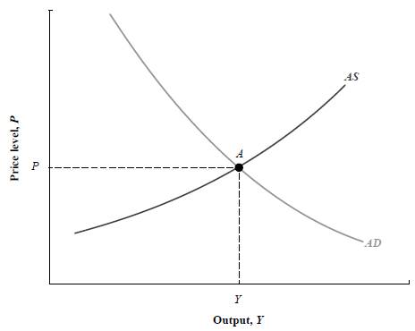 Equation (2) presents a direct relationship between production Y and price P: if production Y increases, the unemployment rate decreases (u = 1-Y/AL). In this way, workers -who gained greater contractual force- require wage increases that companies, given the constant profit margin, finally charge through higher prices P. Once the equations of aggregate demand and aggregate supply are generated, the AD-AS model is ready. It is represented by the intersection of the two curves: the decreasing AD and the increasing AS. Their intersection determines a level of prices (ordinate axis) that is compatible with the level of natural production (x axis) and, therefore, with the natural unemployment rate (labour market model) that represents the state of equilibrium to which market forces tend to bring the economy during periods of tranquillity.
