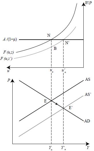 It is important to highlight that in the case we are proposing, in addition to a downward movement of the function of real wages requested by workers, from F (u, z) to F (u, z'), we also have an upward shift of the function of real wages offered by companies, due to increased productivity.