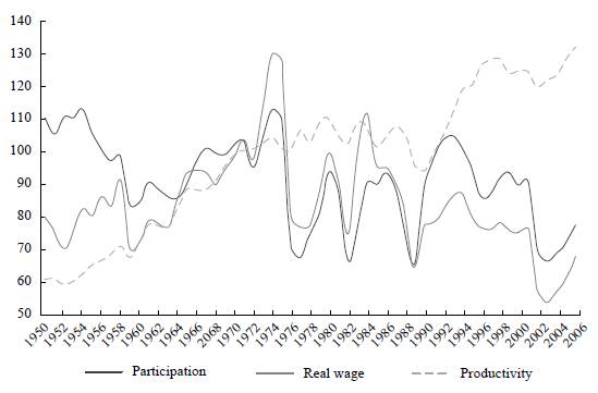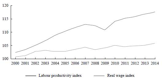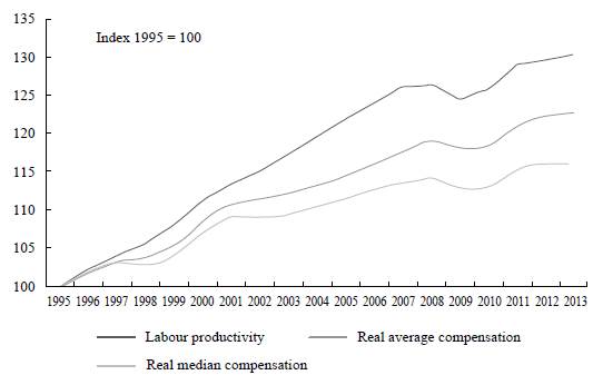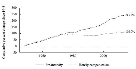 As reported in Gould (2014), "from 1948 to 1979, productivity increased by 108.1 percent and hourly wages increased by 93.4 percent. From 1979 to 2013, productivity increased by 64.9 percent and hourly wages increased by 8 percent." There are doubts about the existence of a direct relationship between the increase in workers' productivity and the real wage that they finally receive.