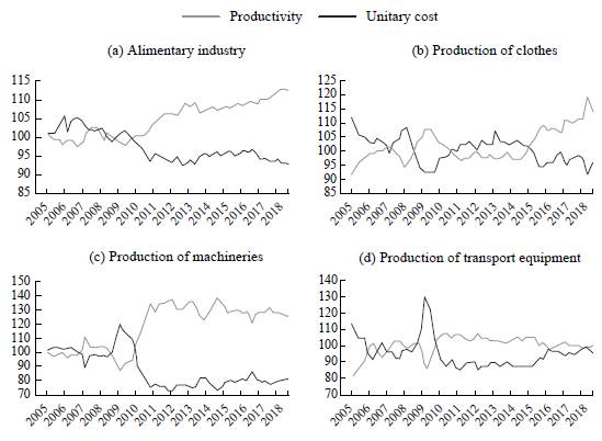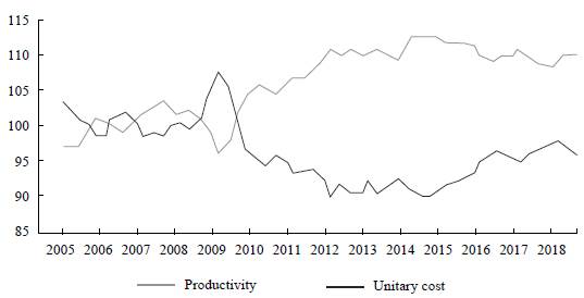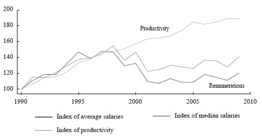 Figure 8 shows the gap between productivity and wages that has been widening in Chile since the new millennium when the policy of greater labour flexibility was promoted. While productivity in Chile increased from 150 to more than 190 at the end of the decade, the average wage index fell during the same period from 150 to below 120.