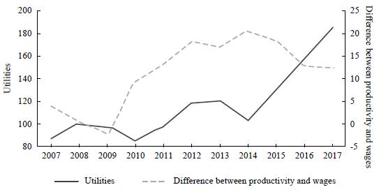 Corella (2019) explains that often during the last decades the story of low productivity has been usually used to justify the not growing real wages. However, the data presented exactly show the opposite. The productivity has been increasing, especially during the last two decades. At the same time, it is argued that the real wage has been actively maintained low thanks to the monopsony power in bargaining the labour contracts with workers (Figure 8).