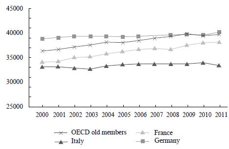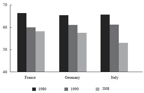 Even in Italy, real wages have not increased dramatically. As Tridico (2014) details, in 2011 the country was at the same levels as in the late 1990s (Figure 4). The wage participation rate has also been drastically reduced both in Italy, in France and Germany (Figure 5).