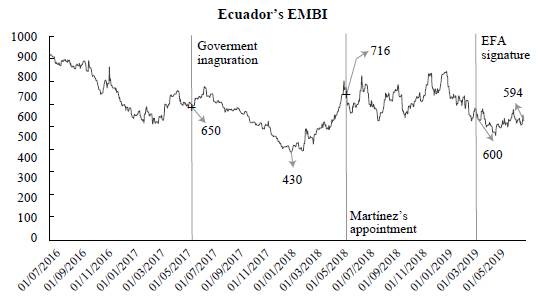 Despite the efforts made by the Ecuadorian government to integrate the country into traditional international financial circuits, it has received very little for its efforts in relative terms, compared, for example, to Argentina. Likewise, despite signing the EFA, the issuing of new bonds has not involved a reduction in interest. This could indicate that the external sector's problems, the country's most problematic economic imbalances, are not considered by the EFA in any way. As a result, neither the country risk nor bond interest has been reduced, as was announced by the IMF's pro bono advocates in Ecuador before the agreement was signed.