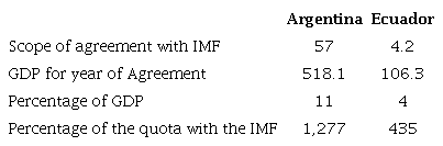 Table 1 displays a comparison of the two agreements, the Argentinian Stand By and the Ecuadorian Extended Fund Facility Arrangement or Extended Fund Arrangement (EFA).