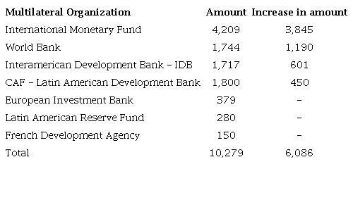 In fact, Ecuador received a little more than a third of the Argentinian loan. If it had obtained a similar percentage of its IMF quota, the EFA would have provided USD 11 billion. However, to justify the smaller amount, the EFA was disseminated together with the loan quotas from other multilaterals (Table 2).