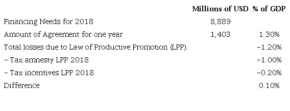 When comparing what has been received from the IMF against the impact of the latest approved tax measures, we can see that the agreement represents 0.1% of GDP compared to what was lost by the LPP. However, due to political considerations, the agreement had to be marketed positively. The IMF contribution was presented together with USD 2,241 million quota increases from three multilat eral organizations, and the credits these organizations had already provided to the country were omitted.