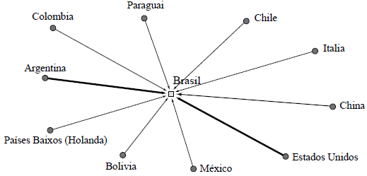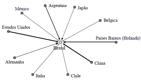 Dessa forma, pode-se compreender que, além de proporcionar uma visão sobre como o relacionamento do Brasil acontece no mundo por meio de suas exportações, essa análise também dará condições de verificar pontos de maior e menor relacionamento, promovendo um conhecimento que pode auxiliar na definição de estratégias para ampliação em intensidade e capilaridade desta rede; afinal, conhecendo melhor a rede, será possível despender esforços para fortalecer laços e também ampliá-la para vislumbrar melhores resultados (Olave & Neto, 2001).