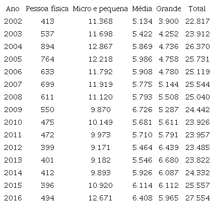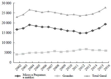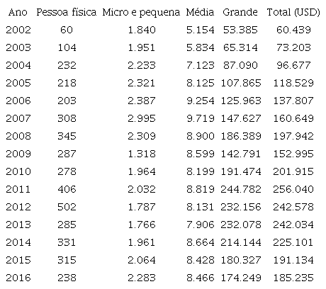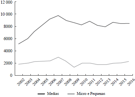 Sendo assim, após essa compressão, se torna relevante verificar a evolução das micro, pequenas e médias empresas, que no período alcançaram um crescimento de 54% no valor de suas exportações, saindo de 6,9 bilhões de dólares em 2002 para 10,7 bilhões de dólares em 2016.
