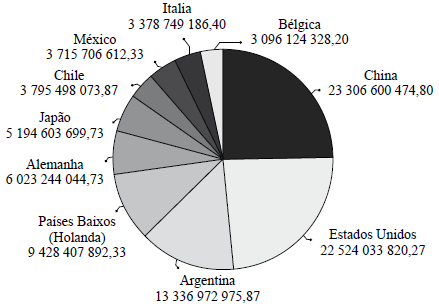 A Figura 3 a seguir retrata os principais países importadores de produtos brasileiros e os seus respectivos valores em FOB dólar americano.