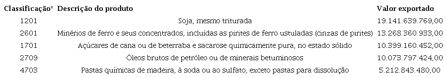 Com o objetivo de ampliar o conhecimento a respeito do que de fato é exportado pelo Brasil, nas Tabelas 3 e 4 serão apresentados os cinco principais produtos que foram exportados no ano de 2016. Pelo fato da enorme diferença entre as micro, pequenas, médias e grandes empresas, será apresentado na Tabela 3 especificamente a respeito das grandes empresas e na Tabela 4 as micro, pequenas e médias.