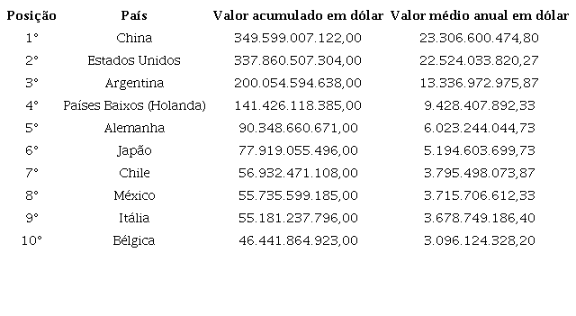 Ao observar a Tabela 6, realizando uma análise comparativa, é possível constatar, por meio do valor médio anual, que não há grande redução da China, que está na 1a posição para os Estados Unidos, que ocupam a 2a posição. Entre ambos, a diferença ou a redução foi de 3,5% apenas. Já quando se observa os Estados Unidos em relação a Argentina, que ocupa a 3a posição, constata-se uma quebra significativa, que alcança uma redução de 68,9%. Pode-se notar, também, que esse padrão de grandes quebras se mantém até o Japão, que ocupa a 6a posição; a partir daí, os valores se mantêm próximos, sem grandes variações.
