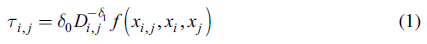 En general, la estructura de costos puede representarse como en la ecuación (1), donde el parámetro δ0 representa un factor de escala de eficiencia del sistema de transporte; δ1 es un parámetro que mide el efecto de la distancia (distance-decay effect). D¡j representa la distancia entre el emplazamiento i y el j4. Además, f constituye una función separable que relaciona determinantes propios del emplazamiento i x¡, factores propios del emplazamiento j Xj y factores compartidos por los dos x:¡J5.