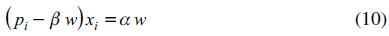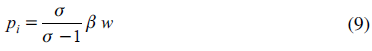 Dado que se asume que la producción industrial tiene lugar bajo competencia monopolística, la fijación del precio para una empresa representativa se muestra en la ecuación (9) y dependiendo de un margen constante sobre el costo marginal11.
