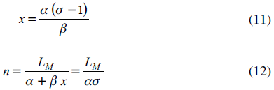 De esta manera, la producción de una empresa representativa será la ecuación (11), en tanto que, asumiendo que a la fuerza de trabajo industrial total será LM , el numero de bienes industriales que serán producidos sigue la ecuación (12)12.