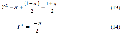 Dado que el este posee la mita de agricultores, como condición inicial, la renta general de la región "este" normalizada a la unidad será la ecuación (13), en tanto que la renta general del "oeste" corresponderá a su distribución de empleados del sector agrícola, en la ecuación (14).