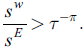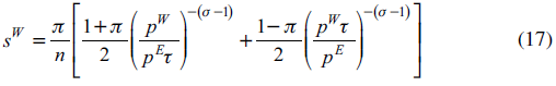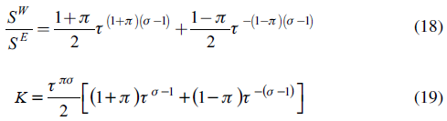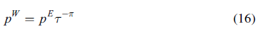 Para que una firma, en estas condiciones, considere desplazarse a la periferia del emplazamiento "oeste" para abastecer ambos mercados, deberá no solo considerar los costos de transporte t, sino también el ofrecimiento de un salario mayor para que los trabajadores del "este" pasen al otro emplazamiento. El salario real del "oeste" será, de esta manera, τ-π mayor que en el "este". Los precios que fijan las empresas corresponden, como se dijo, a una proporción del costo marginal que es, a su vez de acuerdo con la ecuación (9), proporcional al salario pagado. Por lo tanto, el índice de precios del oeste, pW, será la ecuación (16) donde pE hace referencia al índice de precios del "este"13.