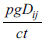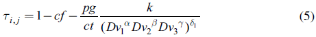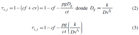 En nuestra formulación, proponemos una variante de la ecuación (1). La idea fundamental que sustenta la ecuación consiste en capturar el papel de las densidades viales para relativizar los costos de transporte a través de la reducción de la distancia relativa -en tiempo de viaje o distancia física-. En esta ecuación cf representa los costos fijos -costos de peajes, pg por ejemplo-, como porcentaje de los costos totales en que incurre la empresa6; , por su parte, hace referencia al precio de la gasolina determinado por unidad de medida de distancia o tiempo de viaje. D¡j representa la distancia entre el emplazamiento "i" y el emplazamiento "j" de tal manera que