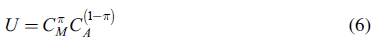 Suponiendo los emplazamientos productivos, "este" y "oeste", con las mismas características para los sectores industrial y agrícola, en el que la fuerza laboral industrial puede desplazarse a cualquiera de los dos emplazamientos dependiendo del salario real pagado, el consumo de bienes agrícolas e industriales sigue la ecuación (6) de utilidad de un consumidor representativo, CM constituye el consumo de bienes industriales, CA de bienes agrícolas y π representa el porcentaje del ingreso gastado en bienes industriales.