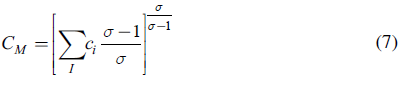 Para asegurar una forma funcional explícita para la elasticidad precio de la demanda de bienes industriales, que siguen una estructura de competencia mono-polística, se considera que el consumo total de CM viene dado por la ecuación (7), de manera que σ representa la elasticidad del precio de la demanda de cada bien industrial para un consumidor representativo (Krugman, 1991).