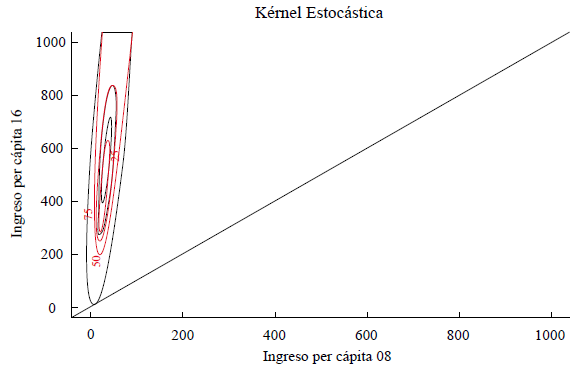 Dado que, en torno a la verificación empírica de la hipótesis de convergencia condicional, existe un amplio debate, el cual vincula la crítica de Quah (1993; 1996a; 1996b), en este trabajo se estimó el kérnel estocástico correspondiente, basado en dicha critica, para confirmar la existencia o no de convergencia, procedimiento realizado por Cosci y Mirra (2018) para robustecer el procedimiento de inferencia estadística. Sin embargo, la aplicación del kérnel estocástico tiene el propósito de capturar las dinámicas distribucionales de municipios alejados para los que la técnica paramétrica de convergencia condicional es limitada.