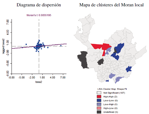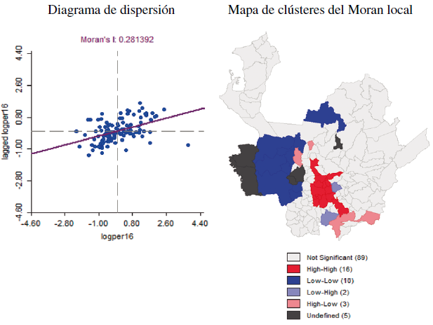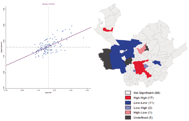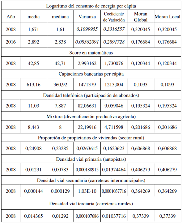 Los estadísticos de Moran local y Moran global reportados en la Tabla 1 permiten establecer evidencias del tipo de patrón espacial subyacente en las variables regresoras y las variables dependientes. Concretamente, tanto el desempeño fiscal, la actividad económica aproximada por el consumo de energía, el desempeño educativo (para 2008), el número de propietarios y la gobernanza civil (2008) y las densidades viales presentan patrones espaciales de dependencia, es decir, el nivel que tenga un municipio del departamento en estas dimensiones depende del valor promedio de sus vecinos. Estos resultados sugieren la necesidad de vincular la dimensión espacial en el análisis máxime si se pretende cuantificar el impacto de la infraestructura vial sobre la convergencia económica de los municipios del departamento.