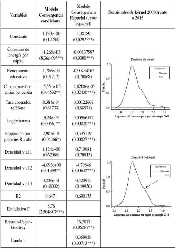En la Tabla 2 se ilustran los resultados de las estimaciones realizadas de los modelos de convergencia condicional y de convergencia condicional con error espacialmente autocorrelacionado ecuación (24). Asimismo, se establecen las densidades kérnel respectivas del consumo de energía per cápita, como aproximación inicial al análisis propuesto por Quah (1996a). Como primera medida, ambos modelos sugieren evidencia de convergencia condicional del ingreso per cápita de los municipios antioqueños para el periodo de estudio18; esto es, los municipios de menor nivel de actividad económica se han acercado en tasa de crecimiento a los municipios de mayor nivel de actividad. Este resultado se confirma por la reducción de las brechas o la varianza del nivel de ingresos en los dos años considerados del análisis (convergencia a). De igual manera, el análisis de los kérneles sugieren que hay un proceso de convergencia, debido a que la densidad de kérnel de 2016 tiene evidencia de menos modas locales con respecto a 2008.