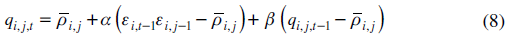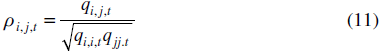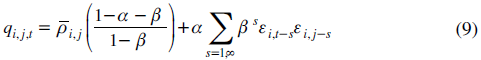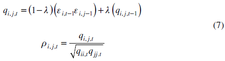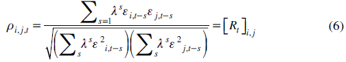 Lo anterior significa un promedio geométrico ponderado de residuos estandarizados. Claramente, estas ecuaciones producen una matriz de correlación en cada momento en el tiempo. Una forma simple de construir esta correlación es a través del suavizamiento exponencial (ecuaciones 7 a 9).