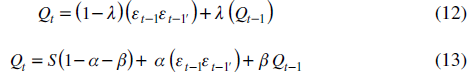 Donde S es la matriz de correlación incondicional de la épsilon, y α y β expresan los parámetros escalares que representan los efectos de choques pasados y correlaciones condicionales dinámicas pasadas en la correlación condicional dinámica actual. Además, existen parámetros escalares no negativos que cumplen la condición de α + β < 1, lo que significa que Qt> 0.