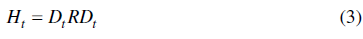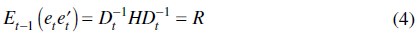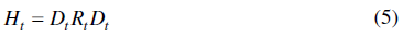 Donde Dt = Diag {hi, t} y R es una matriz de correlación que contiene las correlaciones condicionales, como puede verse directamente desde la reescritura de la ecuación (3) como la ecuación (4), que se muestra enseguida.