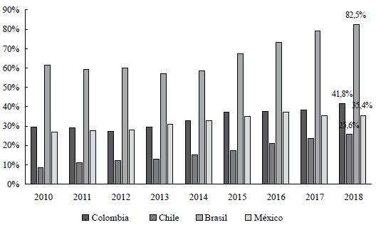 En la Figura 1, se aprecia que, según los datos más recientes disponibles en el Fondo Monetario Internacional (FMI), para 2018, dentro de los países analizados, el más endeudado como porcentaje del PIB es Brasil (82,5 %), seguido de Colombia (41,8 %), México (35,4 %) y Chile (25,6 %). Además, en épocas recientes se ha experimentado alta volatilidad del tipo de cambio a nivel internacional, explicada por diferentes tensiones comerciales y medidas económicas adoptadas por China y Estados Unidos, principalmente. Todo ello ha tenido efecto negativo en las economías nacionales, debido a que las deudas públicas están denominadas en su mayoría en dólares. En este contexto, el uso de CDS constituye una alternativa financiera que permite cubrir el impacto de las fluctuaciones de los mercados nacionales e internacionales en el saldo de dicha deuda.