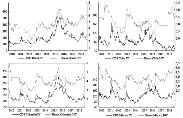Para Colombia, según el Ministerio de Hacienda, a julio de 2016, se pagaban 1,4 % menos en intereses de deuda pública en los mercados internacionales que en febrero de 2015, lo que en cierta medida explica el buen comportamiento del precio de los bonos. La desviación estándar indica, en ambos casos, que los precios han tenido un comportamiento estable, a pesar de los movimientos presentados en los mercados a los que pertenecen. Por su parte, México ha mantenido su calificación BBB+ en los últimos seis años y Chile obtuvo A+ para 2018; Brasil, a pesar de su disminución de BB+ a BB- en 2018 por el caso Odebrecht, mantiene una calificación menos vulnerable a incumplimiento que otras emisiones especulativas.