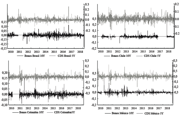 Los datos utilizados para el análisis pertenecen a los países latinoamericanos de Brasil, Chile, Colombia y México. Este conjunto de países se incluyó en el análisis por tratarse de las economías emergentes más fuertes del contexto latinoamericano. De esta manera, se utilizaron los precios de los bonos de deuda pública con vencimiento a diez años y de los CDS a cinco años. Para obtener una medida acertada, las estimaciones se realizaron sobre la serie de los retornos esperados de los precios de los activos de la muestra. Lo anterior tiene sentido, debido a que, al aplicar la prueba de Dickey-Fuller sobre los precios originales en todos los casos, no se rechaza la hipótesis nula de presencia de raíz unitaria. No obstante, al aplicar esa prueba sobre las series de retornos estos últimos, resultan ser estacionarios. Los valores no disponibles (missing), correspondientes a periodos no operativos en uno u otro mercado debidos a festivos, fueron reemplazados por el dato inmediatamente anterior para obtener semanas de cinco días.