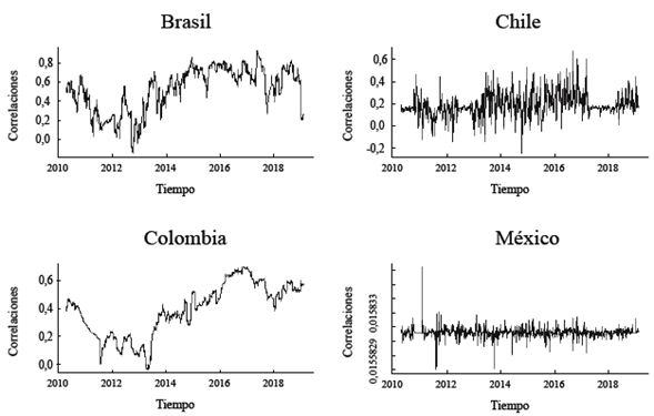 De esta manera, se tomaron datos diarios comprendidos entre el 12 de abril del 2010 hasta el 22 de febrero de 2019, para un total de 2315 observaciones. Las series inician en 2010 para eliminar los datos atípicos debidos a la crisis financiera de 2008 en Estados Unidos, cuyo impacto fue global. Adicionalmente, con el objeto de hacer un análisis que incluyera los principales países del contexto latinoamericano, se tuvo que iniciar desde 2010 dado que solo a partir de ese año empezaron a emitirse estos títulos, para la totalidad de países considerados. La fuente de los datos fue la plataforma de información económica y financiera Bloomberg. Los cálculos del modelo DCC se hicieron en el software estadístico R.