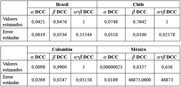 La estrategia de evaluación de este artículo consiste en el uso del modelo DCC para analizar la relación dinámica entre las variables de los bonos de cada país con su respectivo CDS. Se tiene en cuenta la estacionariedad de las variables, tomando los retornos esperados de cada serie temporal para el modelo. A partir de los resultados, es posible determinar si existe alguna correlación entre los bonos de Brasil, Chile, Colombia y México y sus respectivos CDS a cinco años. De ese modo, se muestra si existe un mayor o menor impacto en la calificación soberana, pues los bonos son una variable importante para el cálculo de esta calificación. De comprobarse dicha correlación y tener inversiones de deuda, si existen noticias que afectan un mercado, el CDS puede minimizar el riesgo de baja rentabilidad del portafolio. Este sería el inicio de un análisis de cobertura de precios, donde se estudiaría la posibilidad de usar los CDS para cubrir la rentabilidad de portafolios de inversión que incluyan activos de renta fija, con un riesgo soberano asociado. Con base en los procedimientos ya presentados, se obtuvieron los resultados descritos a continuación.