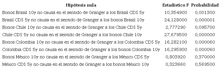 Según la Tabla 1, con base en un nivel de confianza del 95 %, se concluye que, para Brasil y Colombia, existe una causalidad de Granger dada por los CDS para los bonos, y viceversa, es decir, que los CDS tienen cierta influencia sobre el comportamiento de los bonos y se presenta una causalidad bidireccional (los bonos tienen cierta influencia sobre el comportamiento de los CDS).